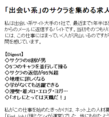 可愛い女性の画像で誘ってメール交換させ、無料を強調しながら、高額の通信料を巻き上げるものだそうです。 「PCからなら、タダじゃない?」と思っても、そこはプロの仕事! あの手この手で、携帯メールに持ち込むらしいです。 当然、皆さんご存知かも知れませんね〜(^-^;)。 でも、つい、好奇心で誘いに乗ってしまうと、大変な事に・・・(^_-)-☆ 何故なら、そのカラクリは??? ![]() これは、ライブドアのサイトに載っていたニュースのコピーの一部ですが、男性が女性に化けて引っかかってきたお客さんと返信メールで通信料を稼いでいた人の言葉です。 インターネットの世界では、こんな仕事にハマって働いている人が大勢いるようです。 女性に成りすまし、あの手この手で通信料を稼ぐのです! 好奇心旺盛な男性の皆様、くれぐれも騙されないよう、気をつけてくださいね〜。 それにしても、このような仕事をして働く人達に、もし家庭があってお子さんが居たりしたら、胸を張って話せる職業でしょうか? 会社に何十台もPCを置いてこういう仕事をさせる会社が蔓延する現社会、本当に困ったものです。 迷惑メールは相手にせず、しっかりネットの健康管理して下さいね(^_-)-☆ NO.316 庭の夏野菜もそろそろ・・・ (06/8/24)昨日23日は処暑。 処暑とは、太陽が150度のときで、暑さが峠を越えて後退し始める頃とか・・・。 まだ昼間は暑い日が続いていますが、朝夕は涼しい風が吹き、気持ち良い時期に入りますね♪。今年の夏は、東北とは思えない日々が今も続いていますが、夜には秋の虫が鳴いています♪ 我家の庭の夏野菜も、そろそろ終わりに近づき、猛暑のお蔭で、けっこう美味しい野菜を楽しむ事が出来ました♪ 沢山採れる時は、ジュースやお漬物など保存食にしますが、そろそろ終わりとなると、だんだん愛しく思えて来るのは私だけ?(^-^;) 今日午前中はフラダンスの自主練習で汗を流し、 午後は終わりに近づいた夏野菜を収穫し、記念撮影してみました(^-^;) 野菜作りの主役は主人です(^-^;) 色々恩恵を受けてますが、草取りなど簡単な作業は、きんぎょの担当です(^-^;) 写真はモロヘイヤ、つるむらさき、ブルーベリ、ミニトマト、完熟トマト、キューリ。 特にブルーベリーは、主人の好みで、PC疲れの目には最高です! まだまだ収穫できますよ〜♪ NO.317 そろそろ秋野菜の準備・・・ (06/8/27)![]() 野菜作り主役の主人が、早々に夏野菜の片付けしていました(^-^;) 「あらら〜、まだ収穫出来るのに〜〜^-^;」と思いつつ、抜き終えたトマト等を片付けながら、記念に盗撮(~=~;) (撮影場所:庭 撮影日時 25日午後5時半頃) ![]() 秋大根の畝を作って肥料入れたり、穴を開けたりしています。 朝っぱらから汗ビッショリ掻いて、 本当にご苦労様〜〜(^-^;) 猫の額ほどの家庭菜園ですが、我家の健康法です〜♪ (撮影場所:庭 撮影日時 26日午前5時半頃) ![]() 種蒔きまでフルコースで働いているところを、庭の草取りしながら又また盗撮(^-^;) たったこれくらいの大根でも、多分、来春まで食べられます♪ 左にチョッと写っているのは、山芋です♪ 大好き野菜ですし、体にも良いので、毎年欠かさず作っています♪ 毎年、趣味のように人間ドックを受けていますので、今年も本日行って来ました。 検査の9割は当日判定が出ますが、 今年も「優秀ですね〜♪」を期待して受けたのに・・・ コレステロールが基準値をオーバーとか〜〜(~=~;) 去年までは、基準値内にしっかり収まっていたのに・・・・(^-^;) やはり、食べ過ぎ?・・・(^-^;) でも、原因は他にもあります。食べてすぐソファに寝転がってTV三昧・・・ 生活習慣、変えなくっちゃ〜〜(^_-)-☆ (主人は良かったみたい・・・^-^;) NO.318 酒の肴にトビタケ(トンビマイタケ)♪ (06/8/29)こちらのお盆の帰省客には、トビタケ(トンビマイタケ)をご馳走するのが定番と聞いていますが、山に生えてる天然物ですと1キロ5000円もする 高級品です(出始めなら1万円?)。何故天然物は高級なのかは、一度体験すると良く分ります(~-~;) 我家には、山歩きのプロが友人にいますので、こんな高級品を時々ご馳走してくれます♪ 見てくれは真っ黒ですが、マイタケの仲間なので味は美味! 今日、お茶飲みの誘いがあって、珍味を食して来ました♪ 画像は、チャッカリ頂いて来たトビタケです(^-^;) でも、お酒は飲んでいません。飲酒運転になりますから〜(^_-)-☆ 飲酒運転と言えば一昨日、福岡市東区「海の中道大橋」で後ろから来た飲酒運転の車に追突されたRV車が海に落ち、3幼児死亡という、 悲しい、悲しい事故がありましたね。 普段どんなに真面目でも、お酒が入ると人格が変わる場合もあるわけですし、飲酒運転に、もっともっと厳しい罰則があってもいいと、被害者の立場でつくづく思いました・・・。 いえ、加害者だって、人生が狂ってしまいます。 肝に銘じて、飲酒運転は絶対避けましょう!! 何故、天然物は高級なのか? トンビマイタケの初体験はこちらでご覧いただけます(^-^;) NO.319 間もなく収穫の