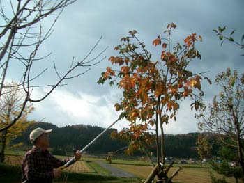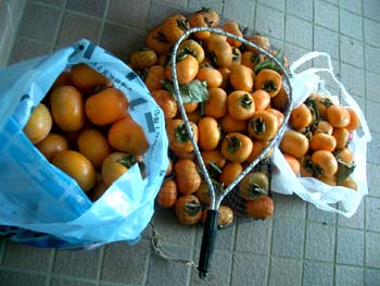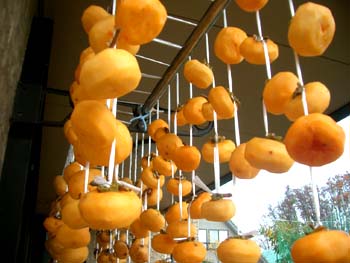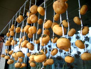 NO.340 恒例の干し柿風景♪ (06/11/10)![]() 昨日(9日)の午後、買物から帰宅したら、玄関の風除室にたくさんの渋柿が?? 「あ、あの人だぁ〜♪」と思って電話で聞いみると「まだ、忙しくって採ってないよ〜」とのこと(^-^;) あらら〜、じゃぁ、この人だぁ〜と、 電話(^-^;) 当たり〜!(^-^;) ↓早速、昨夜夕食後、半分は皮を剥いて干し柿に・・・♪ 残り半分は、今朝、焼酎で渋抜きに・・♪ ![]() ↓我家の柿の木(次郎柿)まだこんなに小さいですが、今年は80個も実をつけました♪ でも、甘柿の筈なのに渋いの何故?(^-^;) 「これも干し柿にしちゃおう〜」ということで、又も午前中はせっせと皮を剥いて干し柿づくり・・・(^-^;) でも、やはり渋柿とは色が違い、いかにも甘そう・・・(^-^;) ![]() 昨年の干し柿の風景が此方のページにも あります(^-^;) |