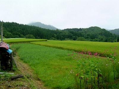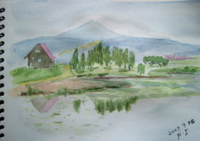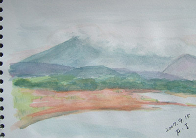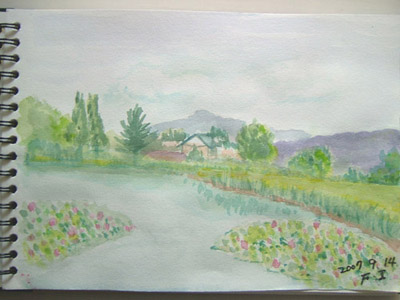 NO.445 またまたスケッチ(~o~) (07/9/4)朝食後のんびりワイドショー観てると、急にスケッチに誘われてしまい、またまたスケッチに出かけることに・・・雲が降りている幻想的な場所探ししながらドライブしてると、「村木」 という山の中に入ってしまいました。 あらら〜、こんな山中でも稲作りをしてるのね〜、 稲掛け(はさかけ)の棒が既に立っていて、横棒はビニールで覆われていました。 その隣りでは、コスモスとアカマンマのお化けみたいな背の高い花が咲いていましたが、本当の名前は何かしら?(-_-;) ![]() ![]() ![]() いつも、スケッチしたものを秘密にしていましたが、今回は遠目でチョッコッとだけご紹介しますね〜(~o~) 左側です(^・^) 主人のスケッチのアップはこちらです。 (^ー^☆♪ そうそう、これだけではつまりませんので、帰宅途中の百合茎から観た好きな景色(蕎麦の花と霞んだ山々)と自宅の花です o(*^▽^*)o この花もそろそろ最後の花になってしまいました〜 (窓から撮影(^_-)-☆) ![]() ![]() |
