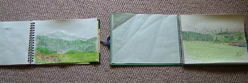 NO.450 懲りずにスケッチ(~o~) (07/9/15)明日から雨予報。 今朝の会話 「なんか予定入ってる?」 「ないよ〜、なんで?」 お〜、嫌な予感・・・・(~o~)またまた、スケッチに誘われた・・・(~o~) 本日もハイ、お付き合いしましたよ〜〜(妻の鏡・・?(^。^)) 何と、連れて行かれたところが、南由利原高原の大谷地池。 前にもスケッチした場所に行くと、 「あれ〜〜? 水が少ない! 何で?」 暫らく歩いて 「此処は、単純だから簡単だろ?」 でも、描き終えたら 「単純って、難しいかった・・・」 描こうとした場所にトンボがいたので記念にパシッっと撮影♪ 描き終わったところでパシッっと撮影♪(^。^) ![]() ![]() ![]() 早く描き終えたせいか、なんとも雑な絵になってしまって。。。(-_-;) ![]() 帰宅途中、矢島町の「花立公園」でもスケッチ。 本日は2枚も描き、これも公開・・・(~o~) 懲りないスケッチ。。。。 主人のスケッチはこちらです。 2枚目は、場所が同じでも見る方向が違います(^_-)-☆ |