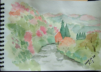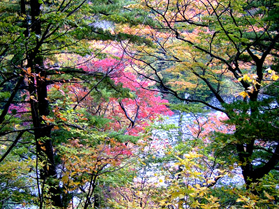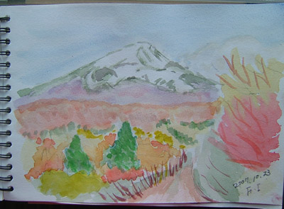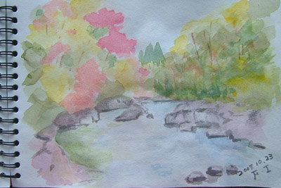NO.461 冠雪鳥海山と紅葉に誘われてて〜〜(^。^) (07/10/23)雨が3日間も続き、家事に専念(^_-)-☆ 昨夜は雷も凄かったのに、今朝は冠雪鳥海山が顔出しました♪ 「スケッチに行くよ〜」とまたまた誘われて・・・(^。^)![]() 今日は、3合目辺りの堰口から法体の滝に向かう観光道路を通りながらスケッチすることにしました(^。^) 滝の紅葉が、どのくらい進んでるのか楽しみ〜〜♪ 最初描いた場所は、発電所の溜池。 鳥海山がこんな素敵な顔見せてくれましたよ〜♪ ![]() ここが発電所の溜池ですが、方向が違うので逆さ鳥海山は見られません。 ![]() 本日の「法体の滝」です。 この3日間の寒さで、一気に色付いたようですね〜♪ ↓滝の上の玉田渓谷散策中↓ チョッと、ロマンチックかしら〜♪ ![]() ![]() 玉田渓谷散策中のモミジ♪ 下から仰いで撮ってみました♪ ![]() 玉田渓谷散策中に見つけた毒キノコ 「ツキヨダケ」 中を裂いたら根元に黒いものがあり、 間違いありません(^_-)-☆ ![]() 本日のスケッチです(~o~) 最初の溜池失敗、2番目の場所は、なんとか公開・・・・(~o~) ![]() ナイショで撮ったけど・・(^_-)-☆ ![]() 3番目の玉田渓谷も・・・公開しちゃいます(^。^) まともな主人ののスケッチは こちらにありますよ〜〜(~o~) 以上、地元の紅葉情報でした〜〜〜ヽ(^。^)ノ |