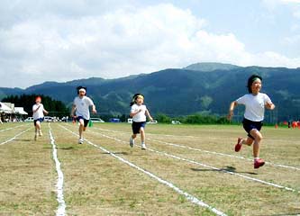 NO.191 田舎の運動会〜♪ (05/5/28)昨夜の雷とドシャブリの雨で心配した地元小学校の今日の運動会ですが、晴天に恵まれ、日焼けを気にしつつ、若い父兄の方や孫の応援に来た方達に混ざって応援してきました♪。 知り合いの子供が走ると我が子を応援しているが如く大きな声を張り上げ、久しぶりに、?十年前の記憶が蘇り、楽しい一日(特に給食タイム〜^-^;)を過ごしてきました〜♪下の画像は、景色の良い小学校のグランドです。 右下のテントの後ろは桜並木です♪ 主人もこのグランドで子供の頃走っていたそうですよ〜。 足の速さは??(^_-)-☆ ![]() ![]()