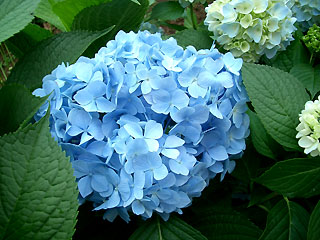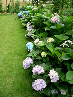 ![]() ところで、この犬の目は外人のようにグリーンの目です♪ 両親は何腫かな? 近所の方も知らないそうです。 この画像だけで、解かる方がいらっしゃいましたら教えてくださいませ〜m(_ _)m NO.201 梅雨に映えるアジサイ♪ (05/7/11)このところ毎日梅雨空で、厚い雲や雨が続いていますが、関東地方などは結構蒸し暑いようですね〜(^-^;)。 こちらの朝夕は、時々肌寒い日があったりしていますが、日中ですと今のところちょうど良い気温です(^_-)-☆ところで数年前、我が家の庭の芝生の端の一部に挿し木で増やしたアジサイの花が、今年も咲き始めました♪ 何処かのアジサイ園のように素晴らしいものではありませんが、ささやかな感動です(^-^;)。 下の画像は今日のアジサイですが、雨で頭が重くなって下がってしまいましたが、花の数は昨年より多い気がします(^_-)-☆