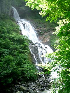 そんなトラノオくんですが、お盆頃から花が咲き始めました。ヒュルヒュルと花茎が伸びてきたな、と思ったら白い花がポツリポツリと開花。花弁が丸く反って、とっても可愛いです♪ 花が咲くなんて初耳だ・・・と思って調べてみると、意外と花を咲かせた方は多いようで、チョッとがっかり(^-^;)。 どうも株がある程度老成してくると花が出やすいようです。 トロピカルな南国調のいい香りと甘い蜜(樹液)が出ました♪ しかし、開花期間は短いです。今日はもう萎んでしまい、満開の時に記念に写しておいて、本当に良かった〜〜♪ (8/16 午後8:30分 撮影) ちなみに、竹でも枯れる前には花を咲かせるとか。 ヤバイ!鉢の中で根が混みあっているのかも? 株分けでもして、若返えって貰おう〜っと(^_-)-☆ NO.210 新発見! 三段の滝 ♪ (05/8/24)久しぶりの好天気となり、またしても山歩きをすることにしました(^_-)-☆ 変わった花が見つかれば・・・と期待しつつ。 場所は鳥海山堰口から法体の滝に向かう途中に池があり、木柵づたいに暫く歩くと「うわ〜〜、こんなところに滝が!」 落差30メートル位ありそうな三段の滝! 水力発電のために利用しているかな? 今まで全く知らなかったけれど、こんなに素敵な滝なのに、観光パンフレットでも見たことがありません(^-^;)。 水しぶきが飛び散り、マイナスイオンをたっぷり浴び、「これぞ、きんぎょの健康術!(^_-)-☆」と、ささやかな幸せに浸って来ました♪ ![]() 右上の画像は、滝の落下地点の雰囲気です。 画像では見にくいですが、顔に水しぶきがかかり、とってもいい気持〜♪ 右の方から川が流れています。 以上地元情報、新発見でした〜♪ (鳥海町ご出身の方、ご存知でした〜?(^_-)-☆) |